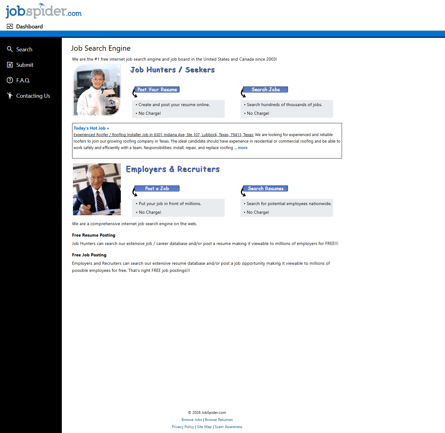 - `free job search engine and job board in the United States and Canada since 2003`라는 메시지로 broad reach를 바로 설명한다.